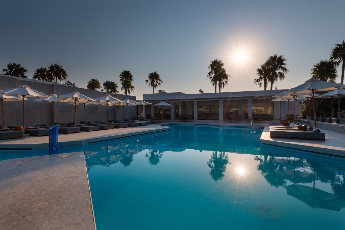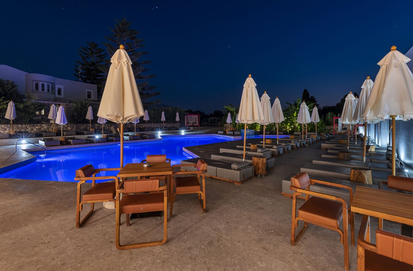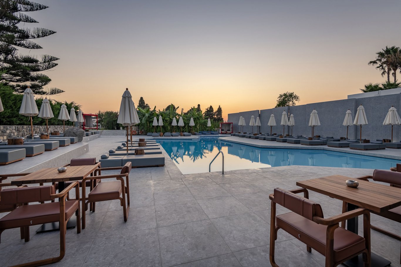 The outdoor pool, framed by modern sun loungers and minimalist landscaping, is a focal point for guests looking to unwind under the Mediterranean sun. Nearby, the poolside bar serves a selection of drinks and light bites throughout the day, offering the perfect setting for a lazy afternoon. The bar operates from 9:00 to 1:00, providing cocktails, coffee, and snacks in a stylish yet relaxed setting, enhanced by lounge music and warm island breezes.