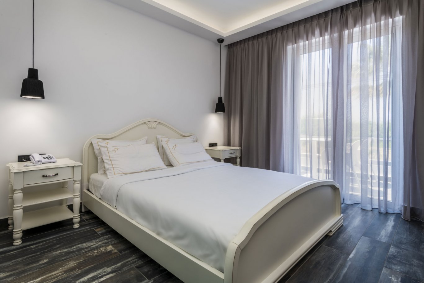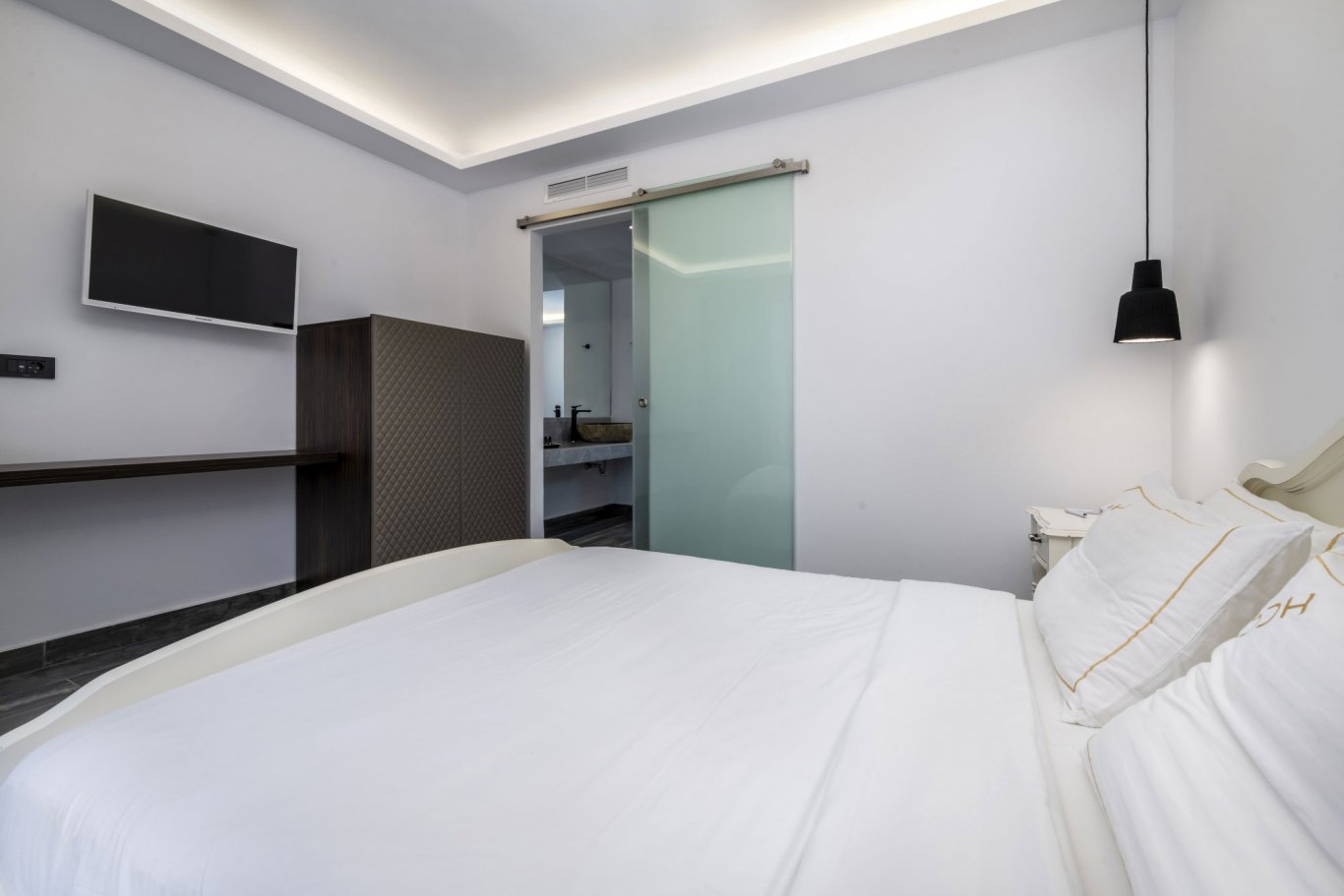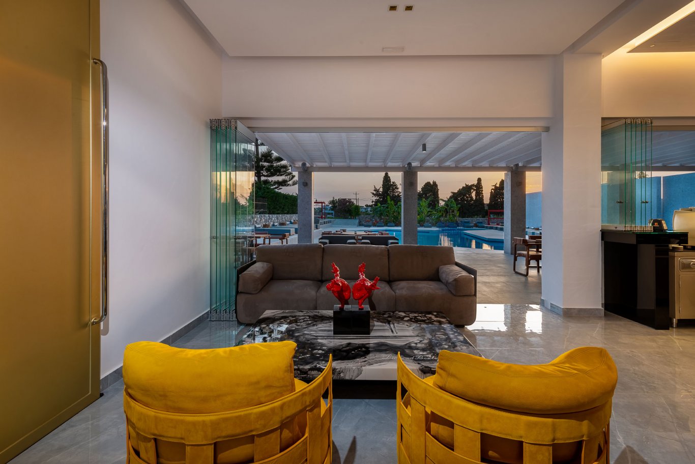 The outdoor pool, framed by modern sun loungers and minimalist landscaping, is a focal point for guests looking to unwind under the Mediterranean sun. Nearby, the poolside bar serves a selection of drinks and light bites throughout the day, offering the perfect setting for a lazy afternoon. The bar operates from 9:00 to 1:00, providing cocktails, coffee, and snacks in a stylish yet relaxed setting, enhanced by lounge music and warm island breezes.