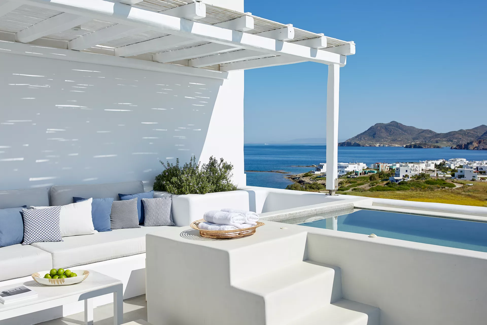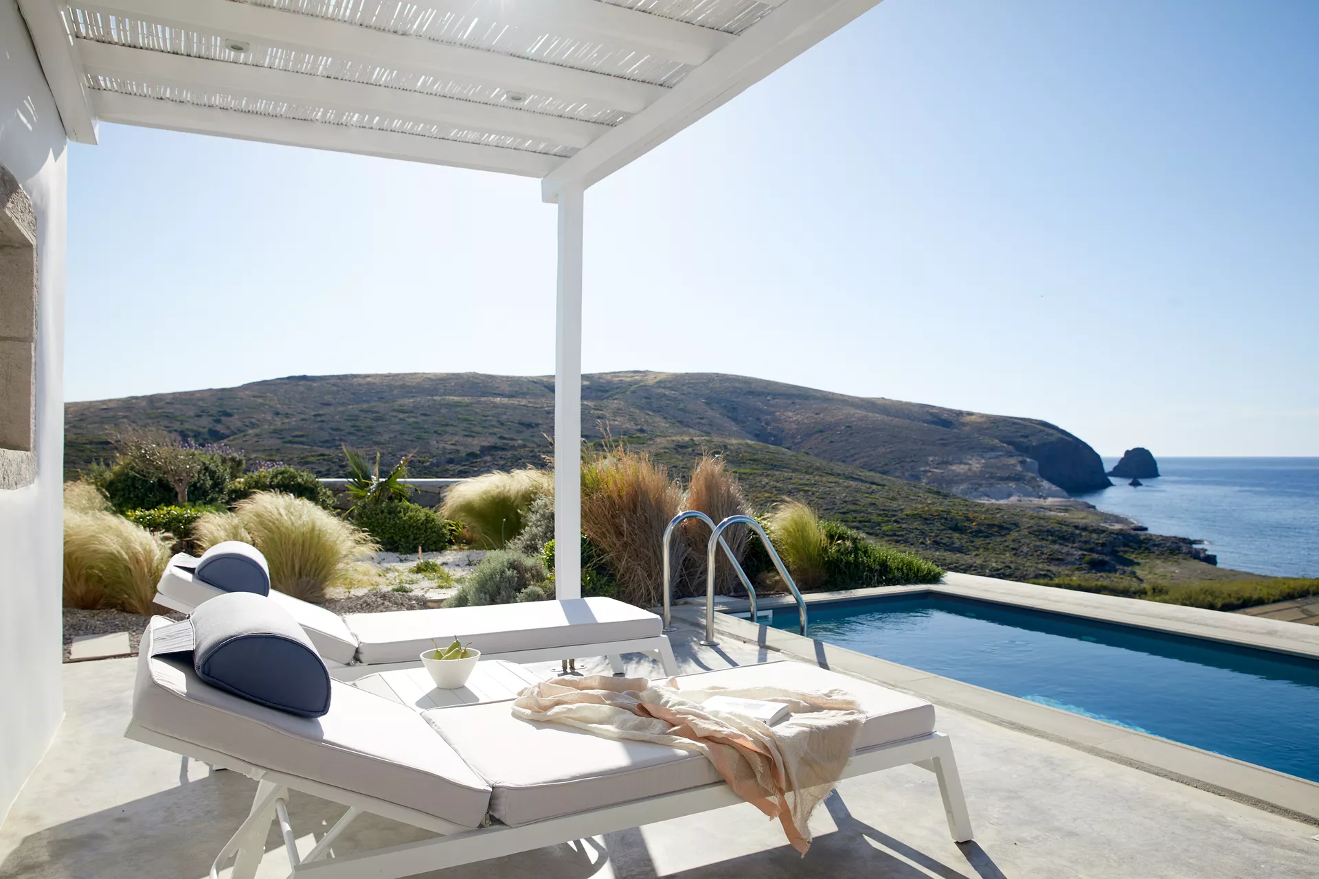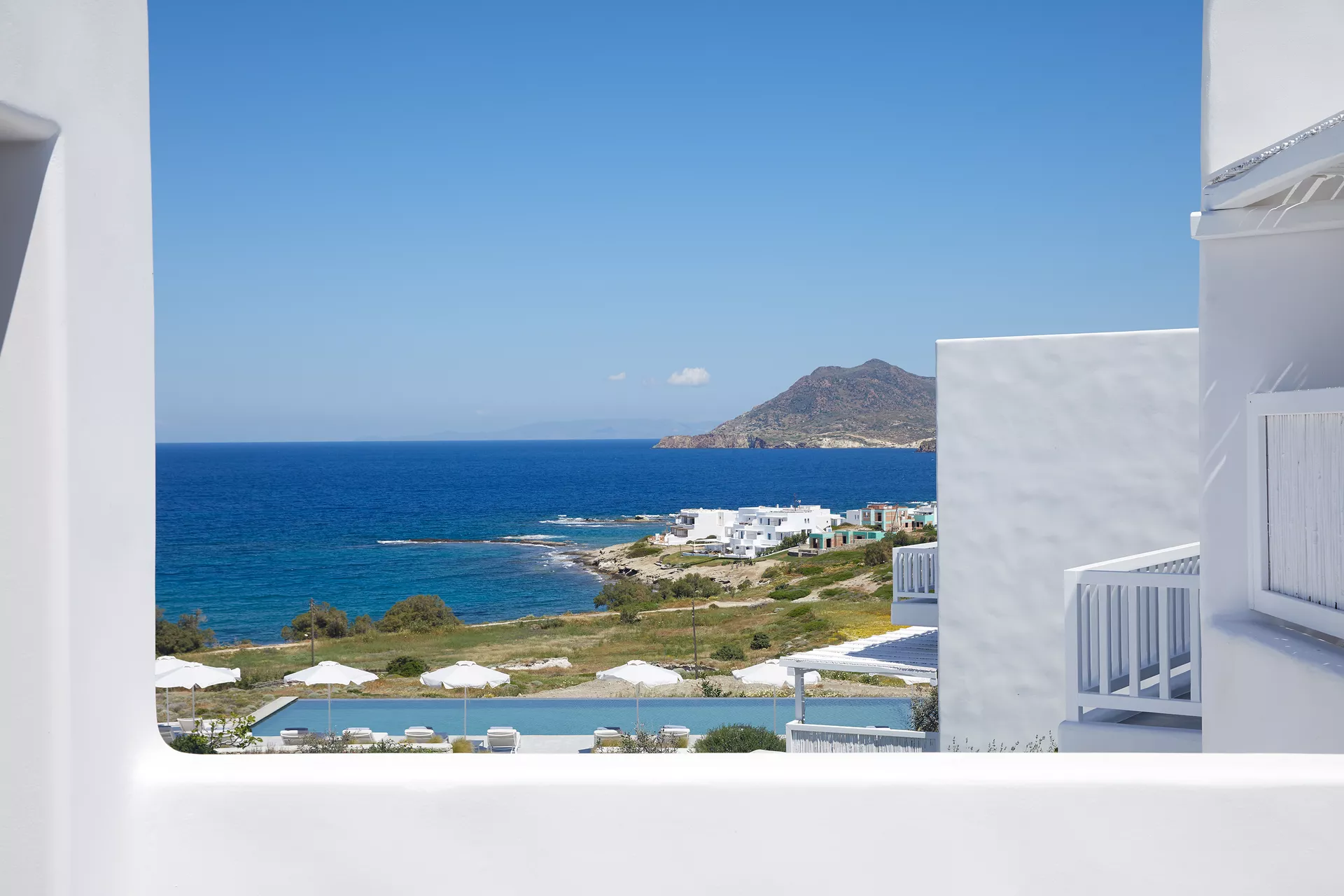 Milos Breeze Boutique Hotel is a 4-star retreat set on a clifftop in Pollonia, offering uninterrupted panoramic views across the Aegean Sea and nearby islands such as Kimolos, Sifnos, and Polyaigo. Designed with a minimalist Cycladic aesthetic, this boutique property blends traditional architecture with modern luxury to create an atmosphere of refined elegance and serenity. Surrounded by nature and overlooking the bay, the hotel provides a tranquil escape that captures the essence of island living.