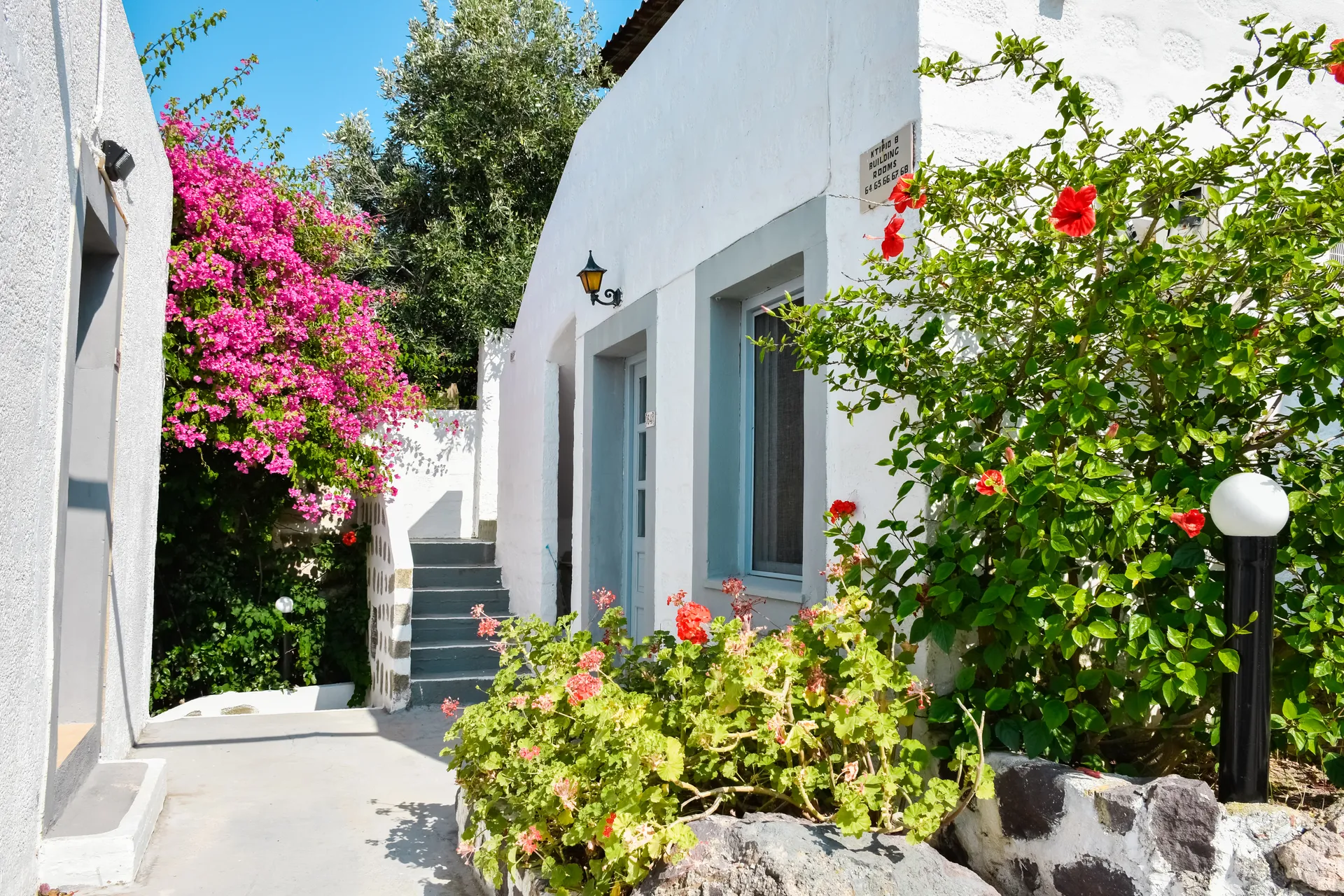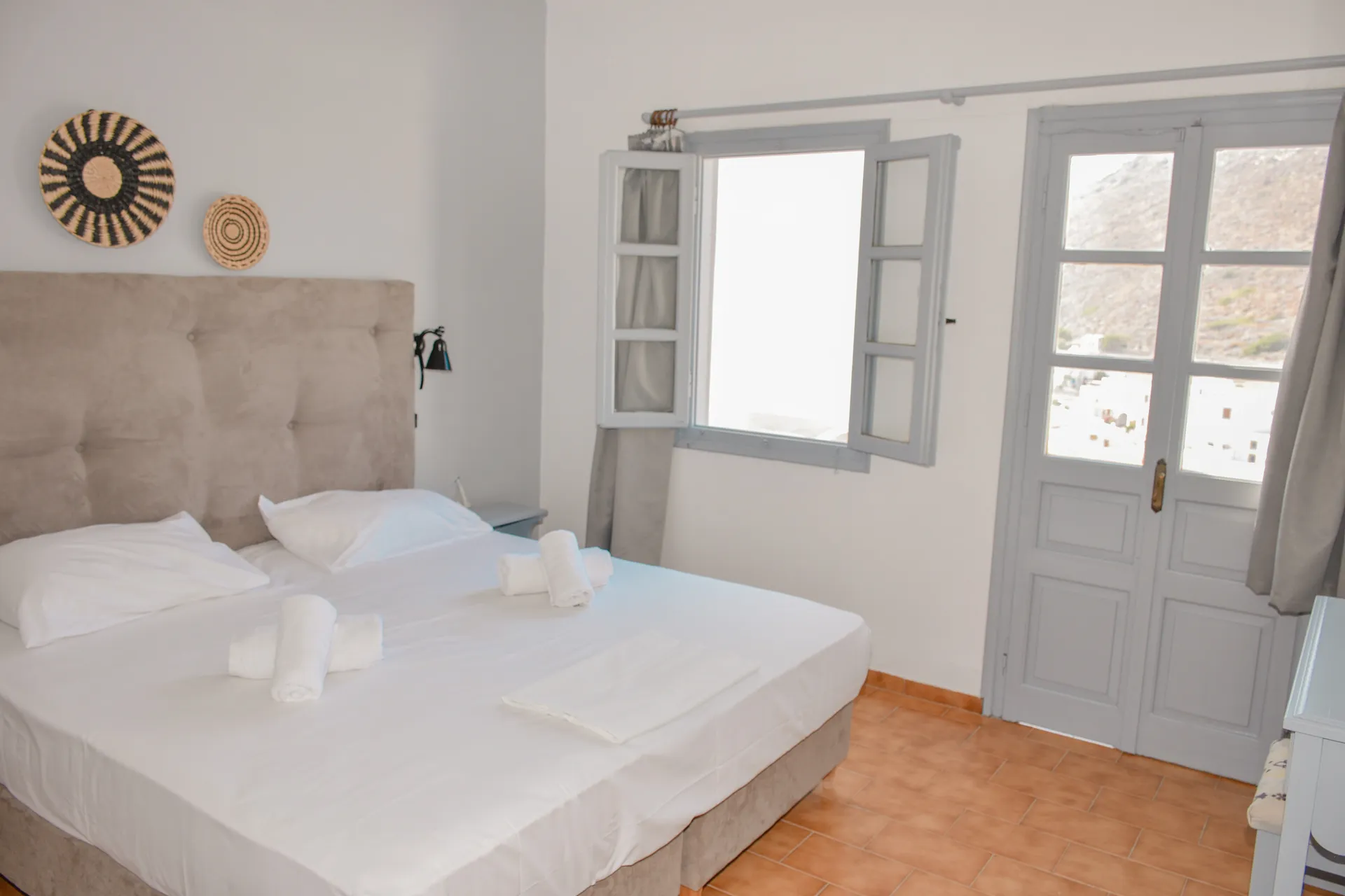 Set in an amphitheatre-style layout, the hotel’s 60 bungalow-style rooms are bright, spacious, and decorated in a minimalist, contemporary style. Many rooms open onto private verandas with views across the port and the Ikario Sea, capturing the island’s spectacular sunsets. Accommodation options include standard double or twin rooms, as well as triple rooms, all equipped with twin or king-size beds, air conditioning, and en-suite bathrooms.