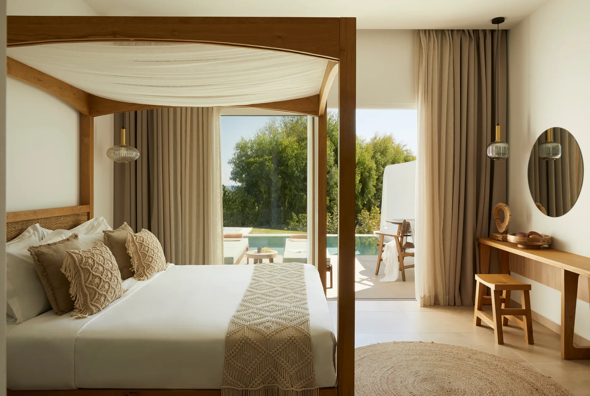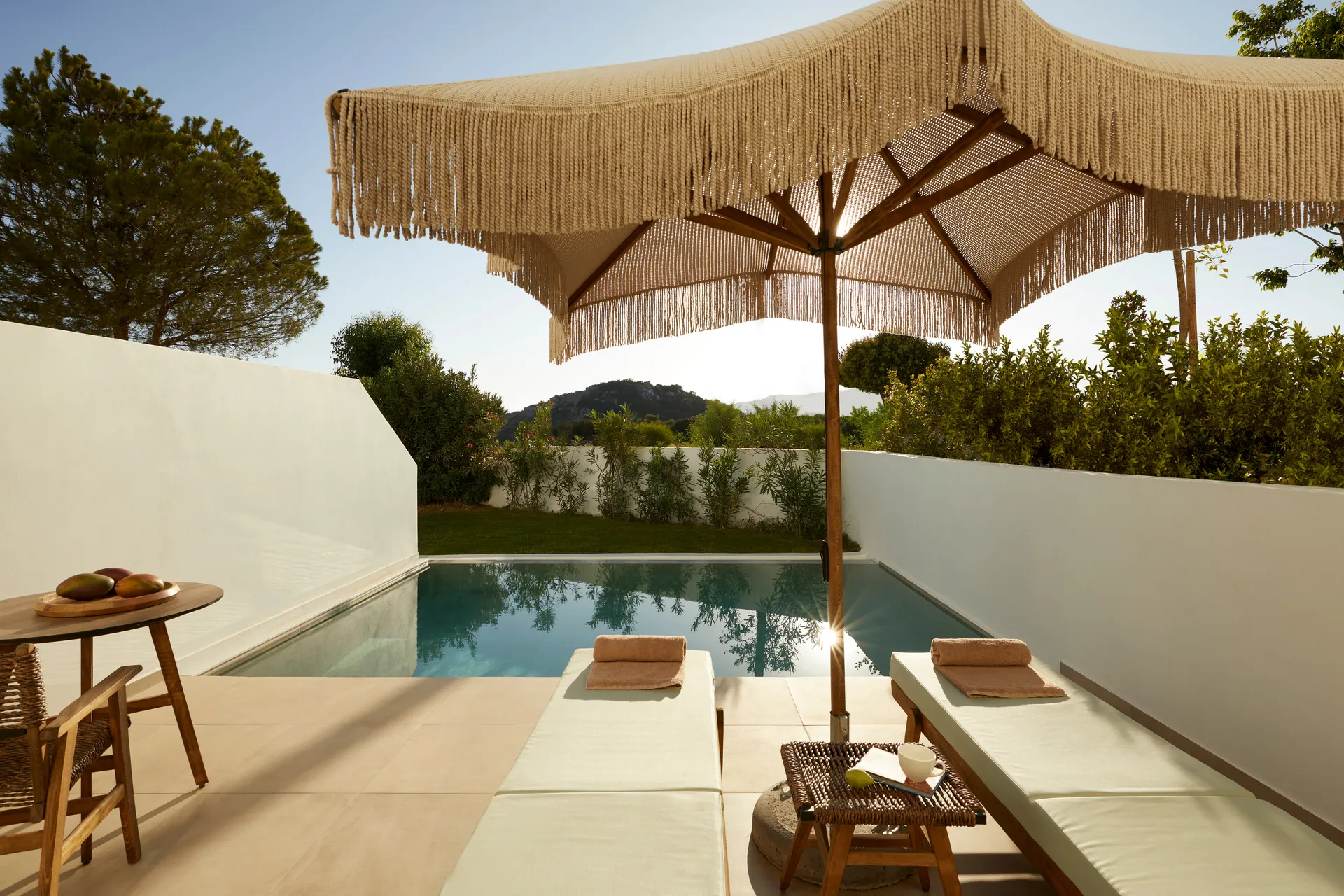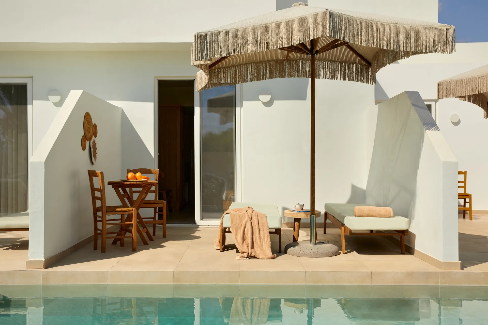 The luxurious Junior Suites, located on the top floor, offer more space and comfort, with the added indulgence of a private jacuzzi. For those seeking even more luxury, the Duplex Suites provide ample space with a private pool, a living area downstairs, and a mezzanine sleeping area.