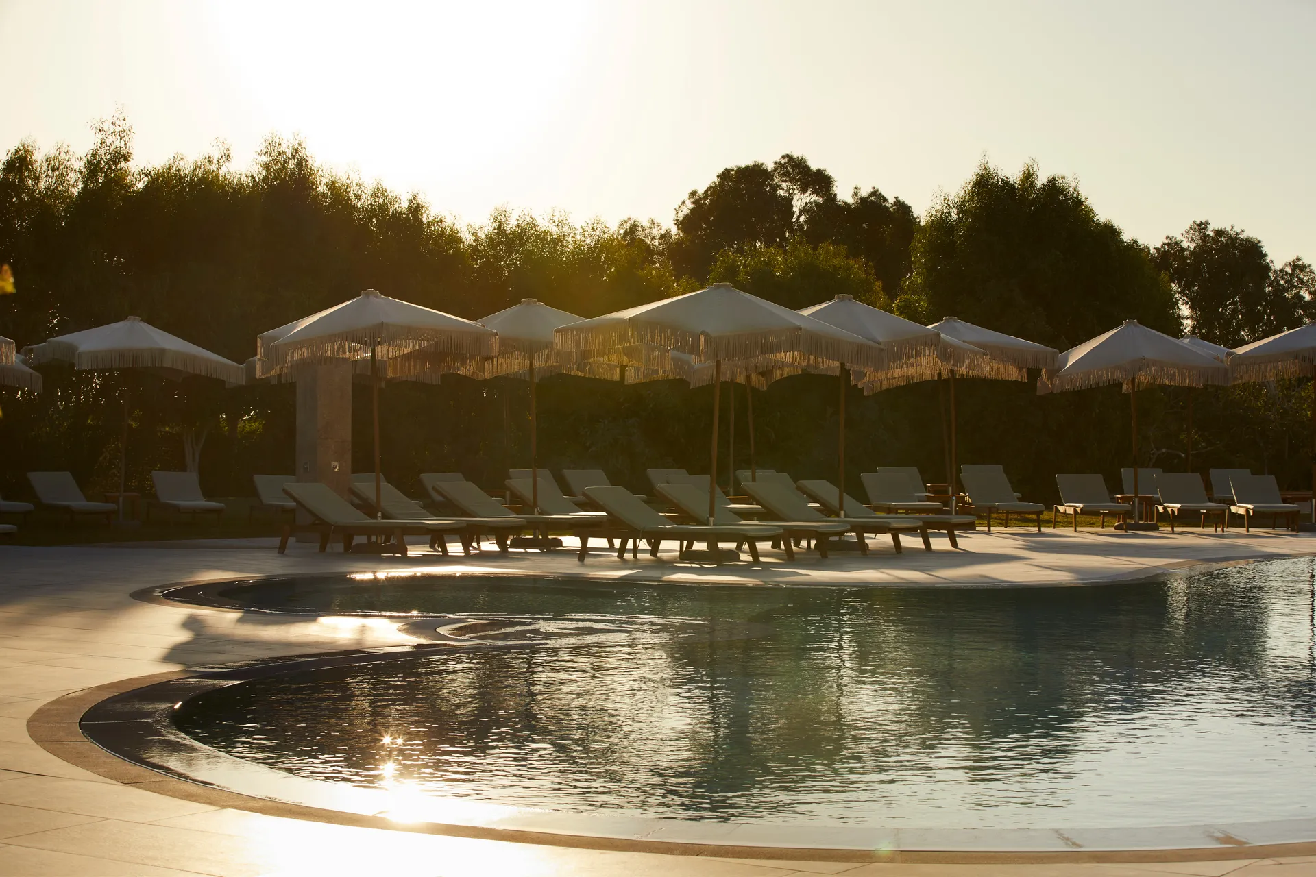 The hotel’s outdoor swimming pool is a guest favourite, surrounded by elegant sun loungers and stylish umbrellas. The pool area provides a relaxing atmosphere, perfect for unwinding. Guests can enjoy refreshing beverages or delicious cocktails from the pool bar while lounging on sunbeds amidst a serene green landscape.