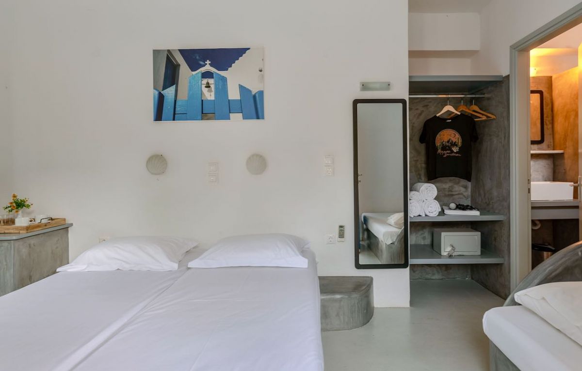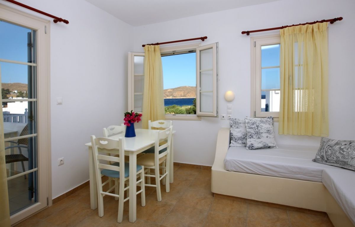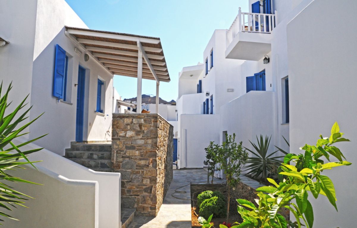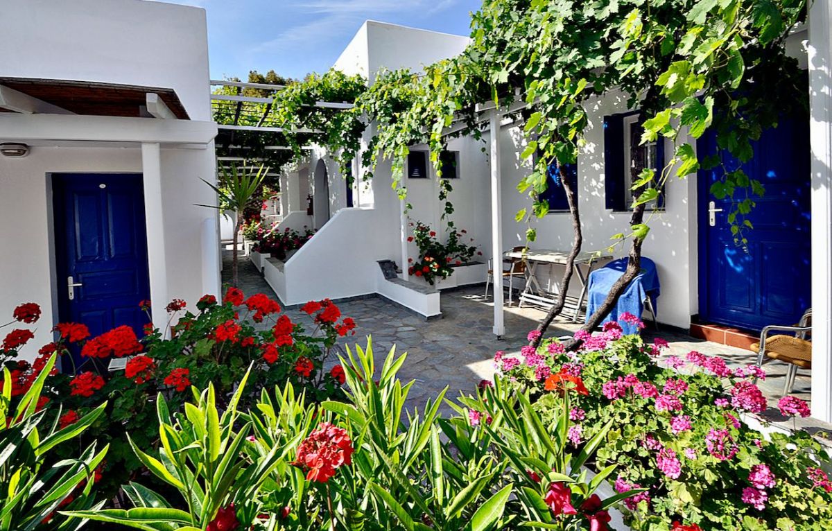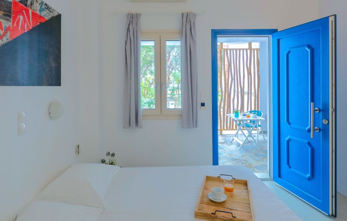 The separate Coralli Apartments offer further accommodation choices, including open-plan spaces with built-in beds and garden views, one-bedroom apartments with sea views, and two-bedroom apartments that can host up to six guests. Each apartment is fully equipped and furnished in the traditional Cycladic style with thoughtful touches to ensure a comfortable stay.