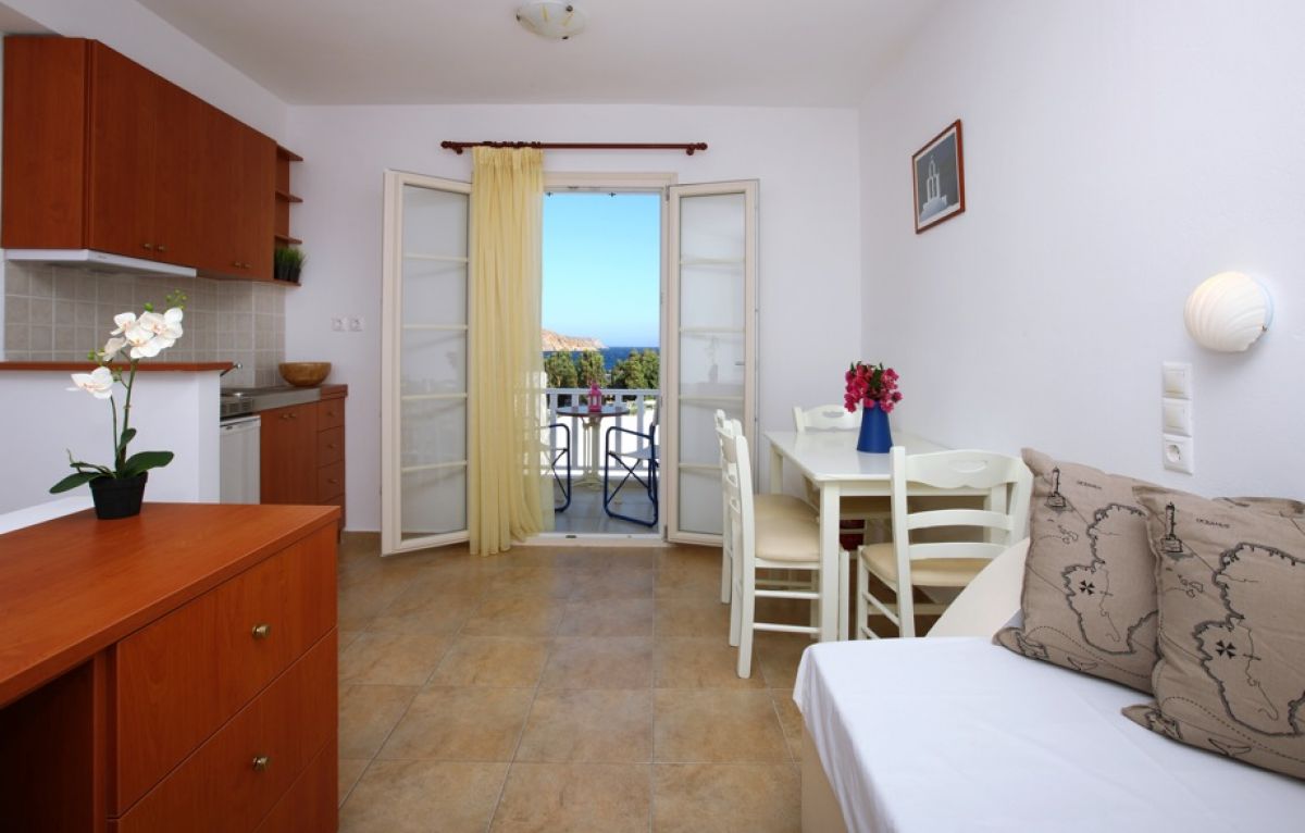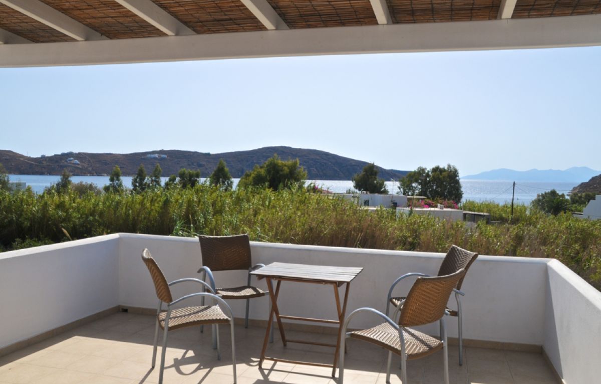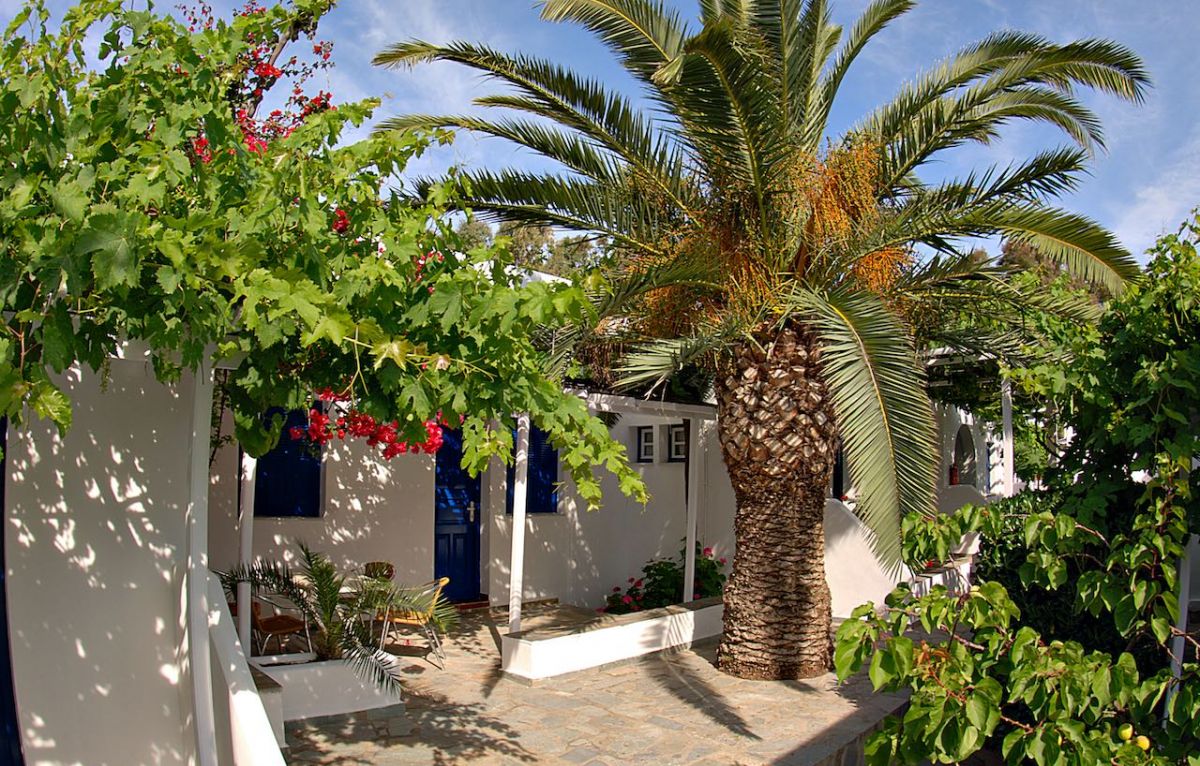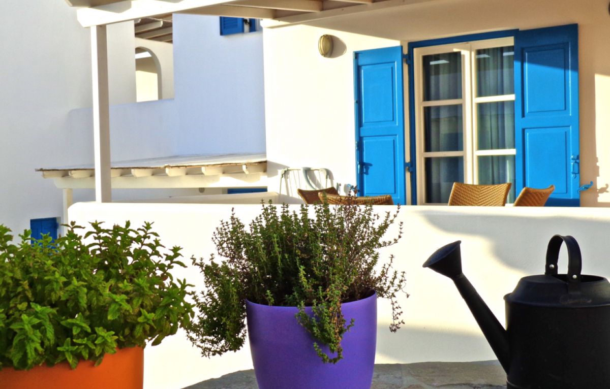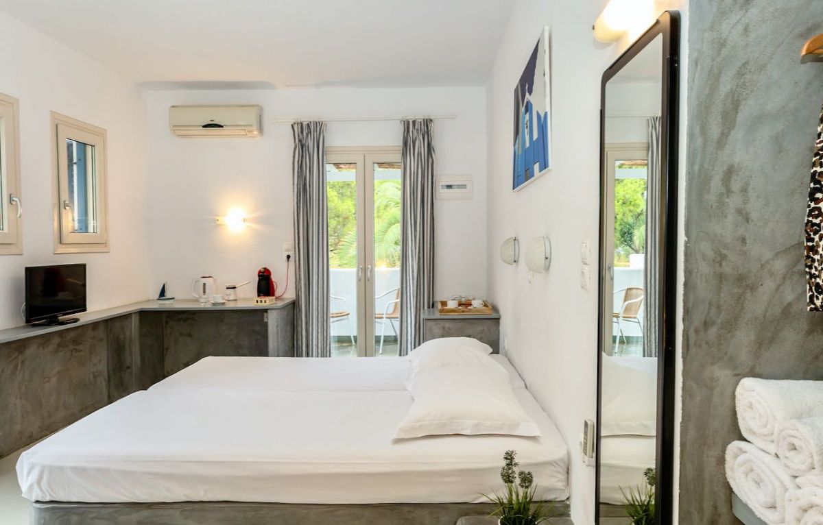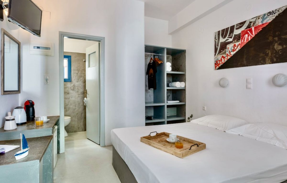 The separate Coralli Apartments offer further accommodation choices, including open-plan spaces with built-in beds and garden views, one-bedroom apartments with sea views, and two-bedroom apartments that can host up to six guests. Each apartment is fully equipped and furnished in the traditional Cycladic style with thoughtful touches to ensure a comfortable stay.