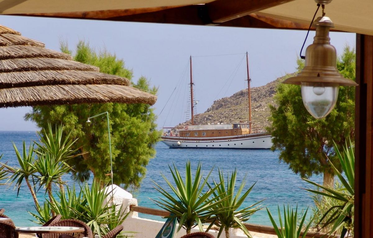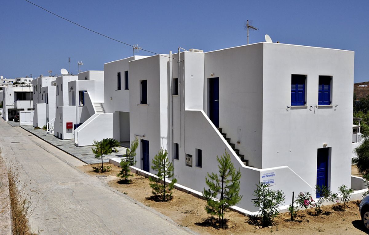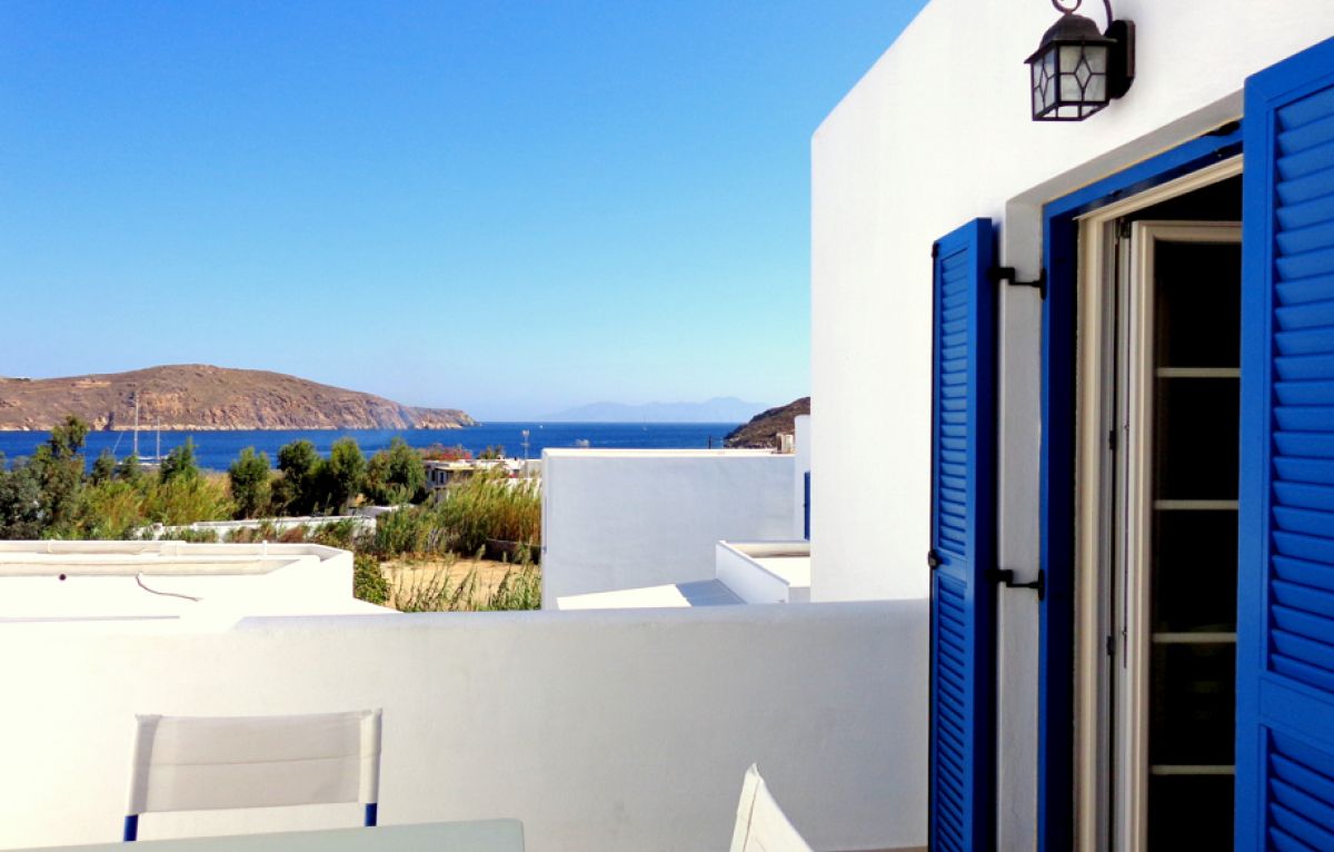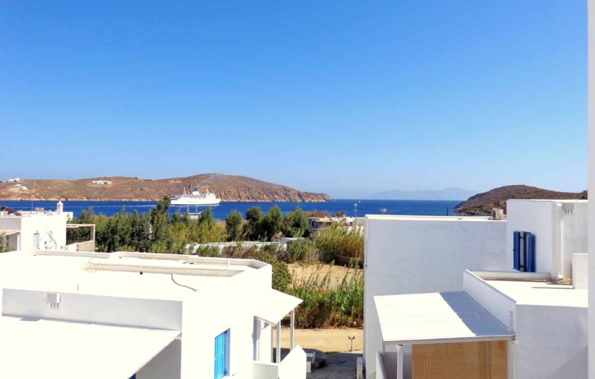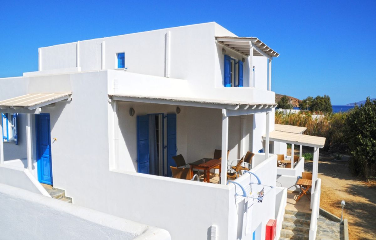 The separate Coralli Apartments offer further accommodation choices, including open-plan spaces with built-in beds and garden views, one-bedroom apartments with sea views, and two-bedroom apartments that can host up to six guests. Each apartment is fully equipped and furnished in the traditional Cycladic style with thoughtful touches to ensure a comfortable stay.