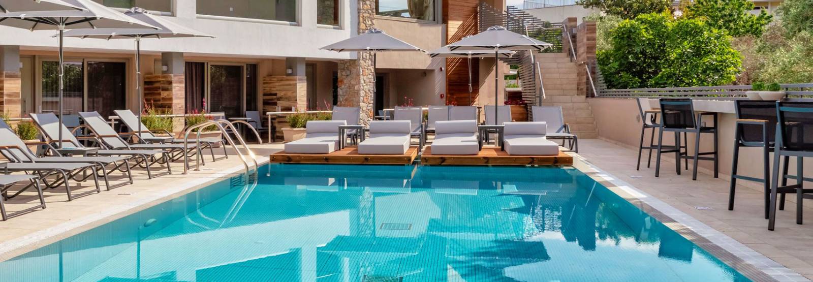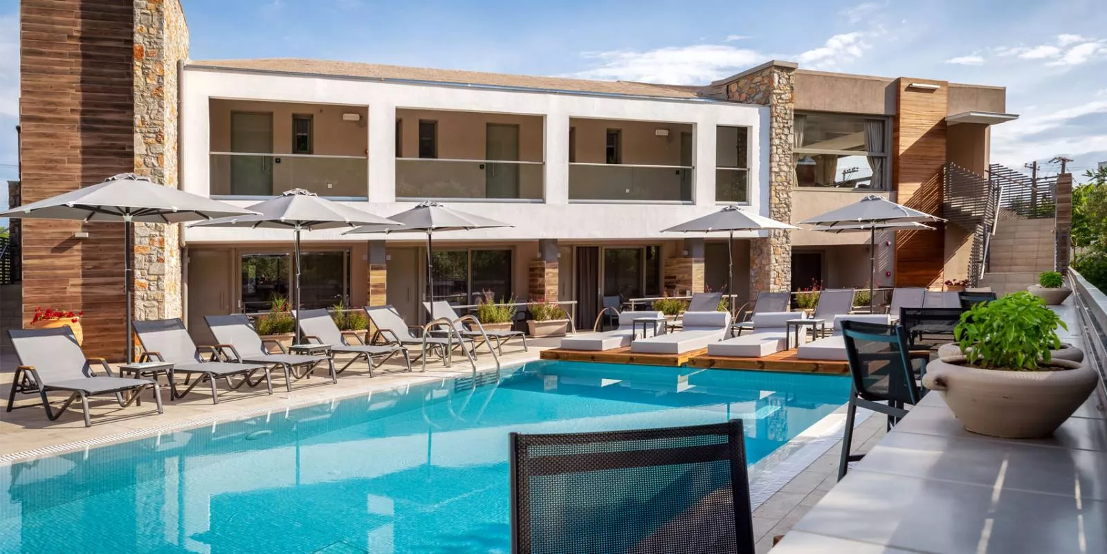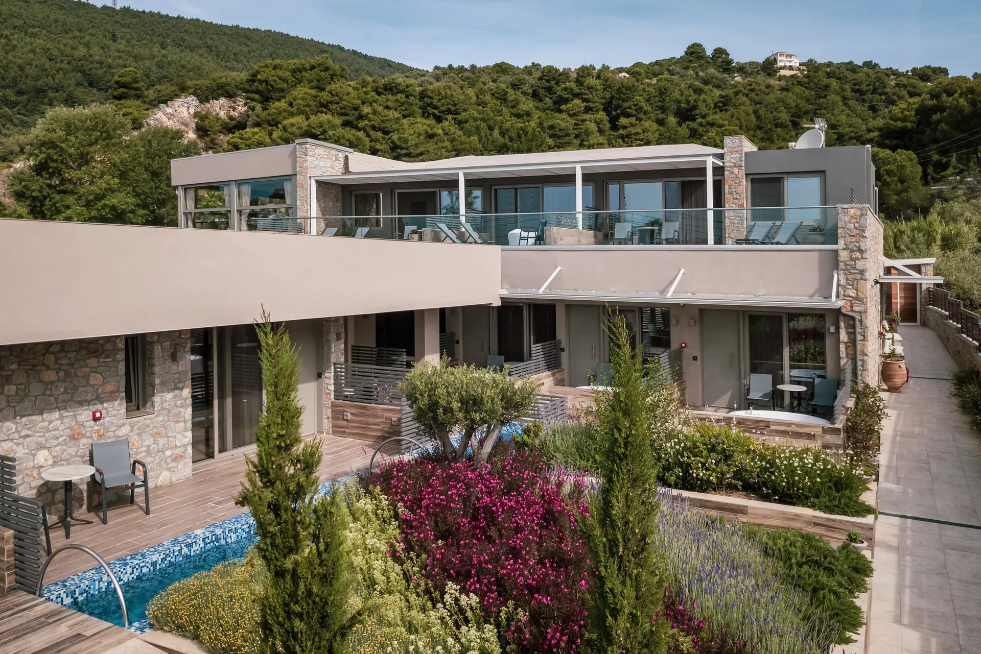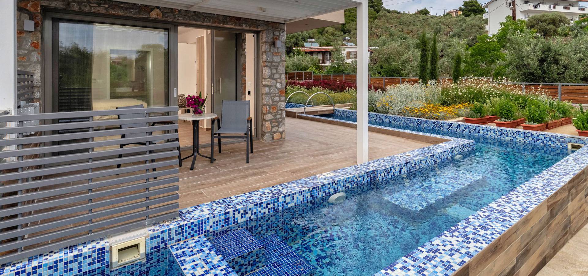 Each accommodation is enhanced by a fully integrated KNX electrical installation system, offering intuitive control over lighting, shutters, heating, ventilation, and energy management. This technology ensures a tailored experience in every space, allowing guests to personalise their environment effortlessly. Spacious balconies and terraces open onto views of the lush garden or the inviting shared pool, while each suite includes a private Jacuzzi designed for complete relaxation.