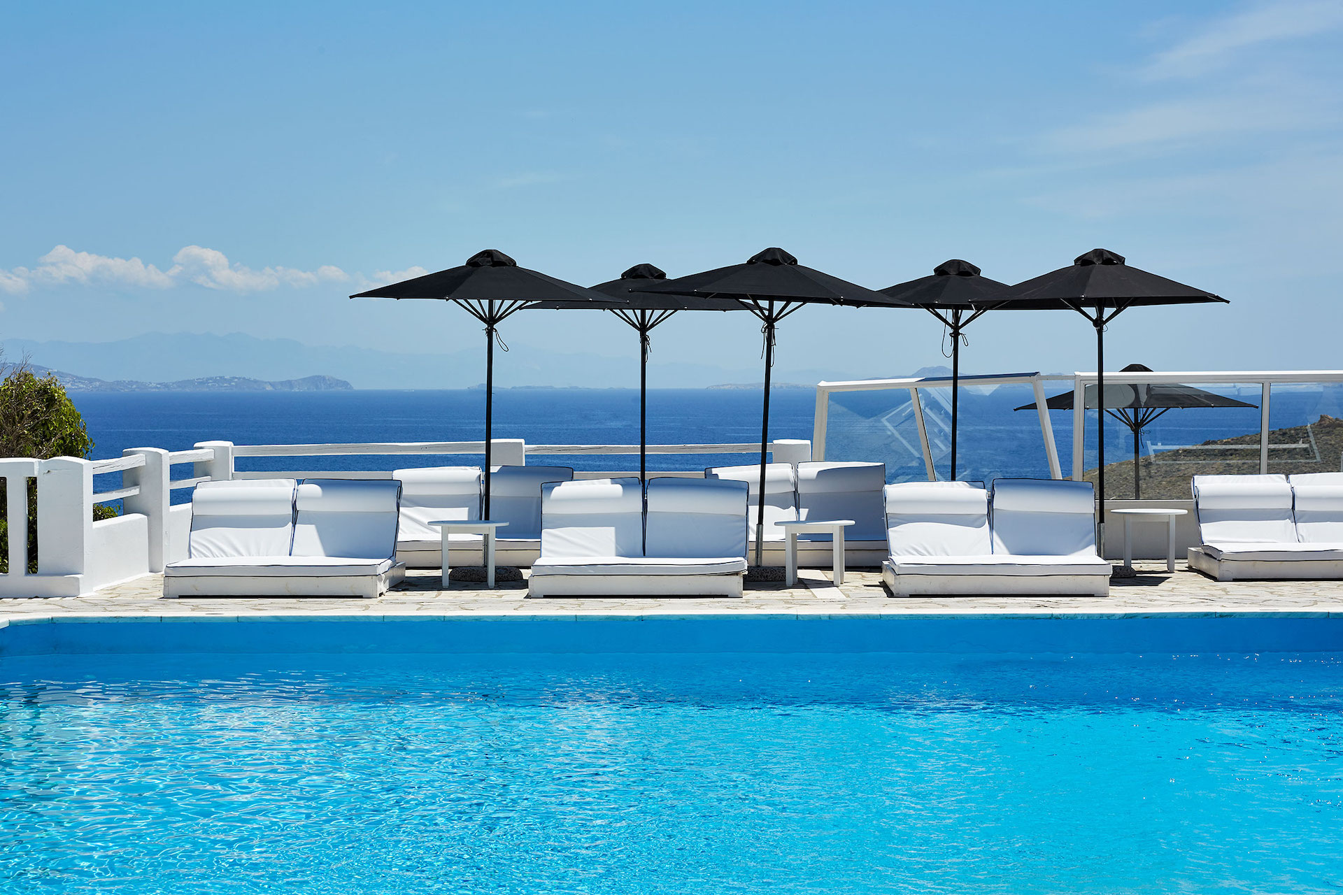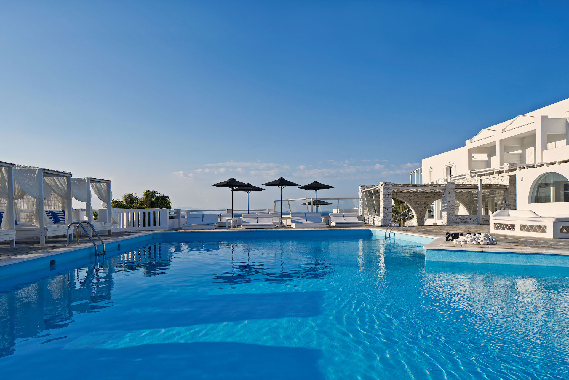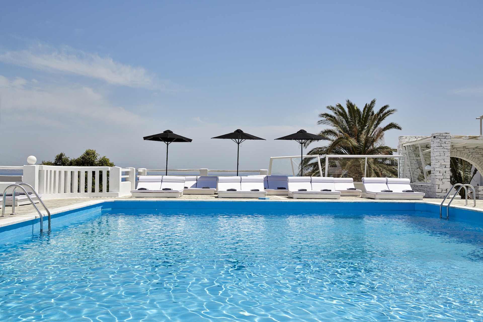 The property features bright, modern spaces accented by whitewashed walls, stone details, and clean architectural lines that reflect the island’s heritage. Each area overlooks either the serene gardens or the inviting freshwater swimming pool. Sun loungers line the pool terrace, providing a setting for guests to unwind while enjoying light snacks, refreshing cocktails, or chilled beverages.