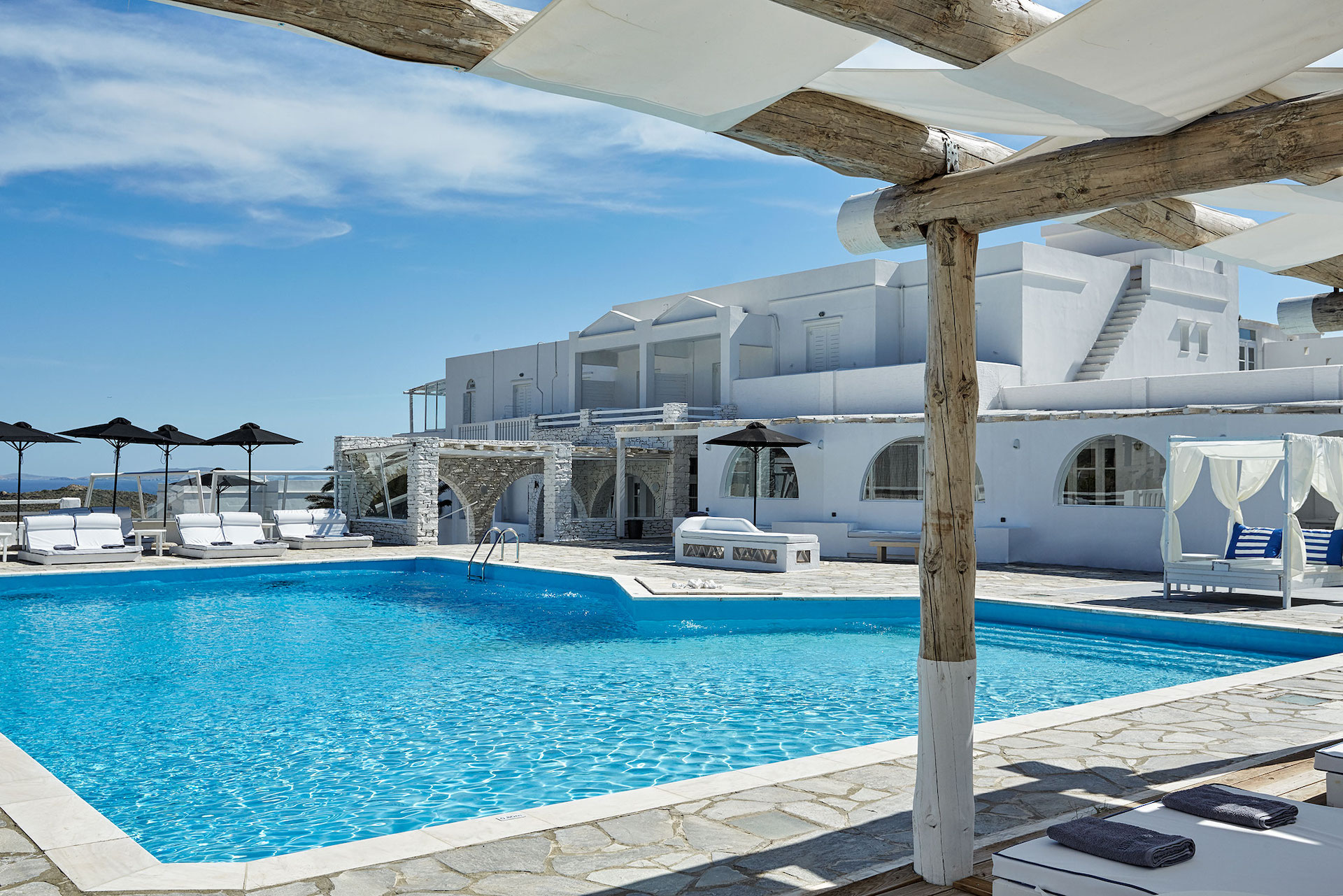 The hotel’s main restaurant serves a daily breakfast that celebrates local ingredients and Mediterranean flavours. Throughout the day, guests can relax by the pool, explore nearby beaches, or discover the island’s many cultural and historical sites. Agios Ioannis Porto, in particular, offers spectacular views across the Aegean Sea and a coastline ideal for swimming and sunbathing.