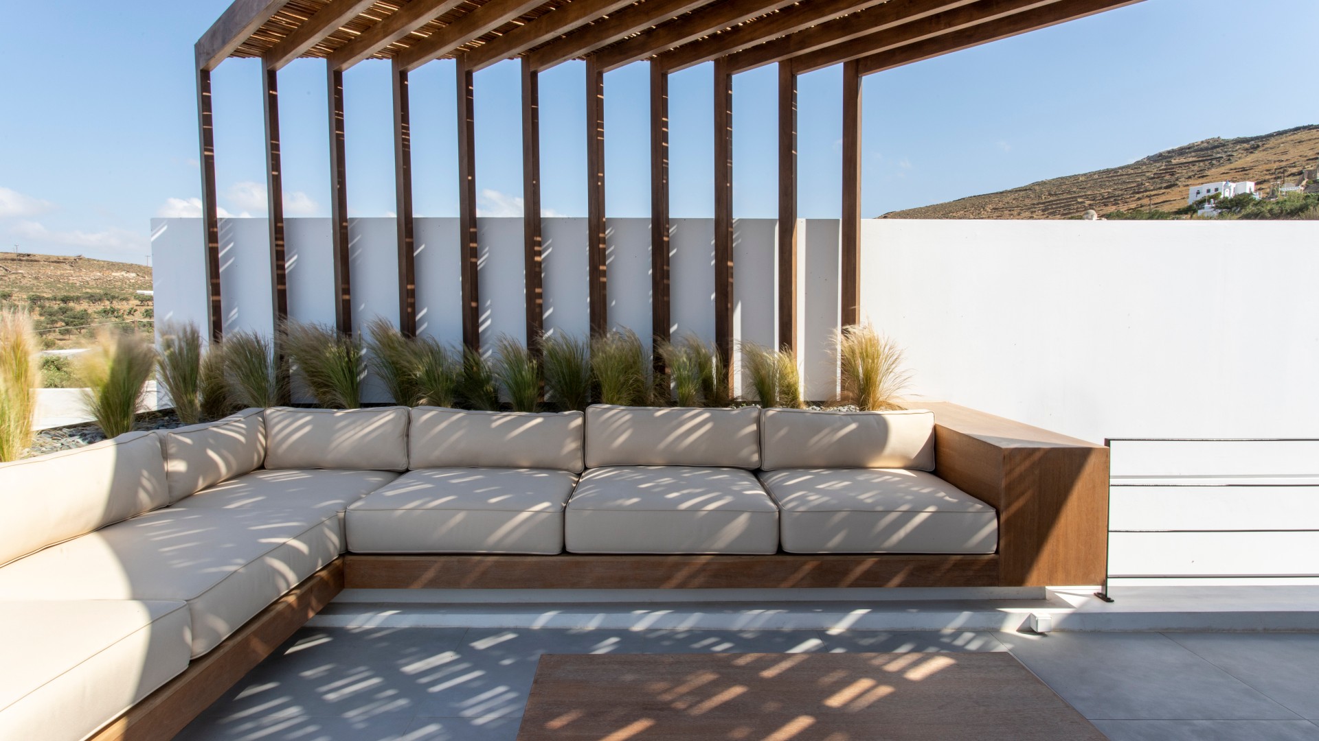 Outdoor spaces complete the PNOĒS atmosphere. Against the backdrop of the Aegean Sea and the richly cultivated farmland, the gardens and outdoor walkways unravel between lush and sculptural, natural and manicured, light and shade.