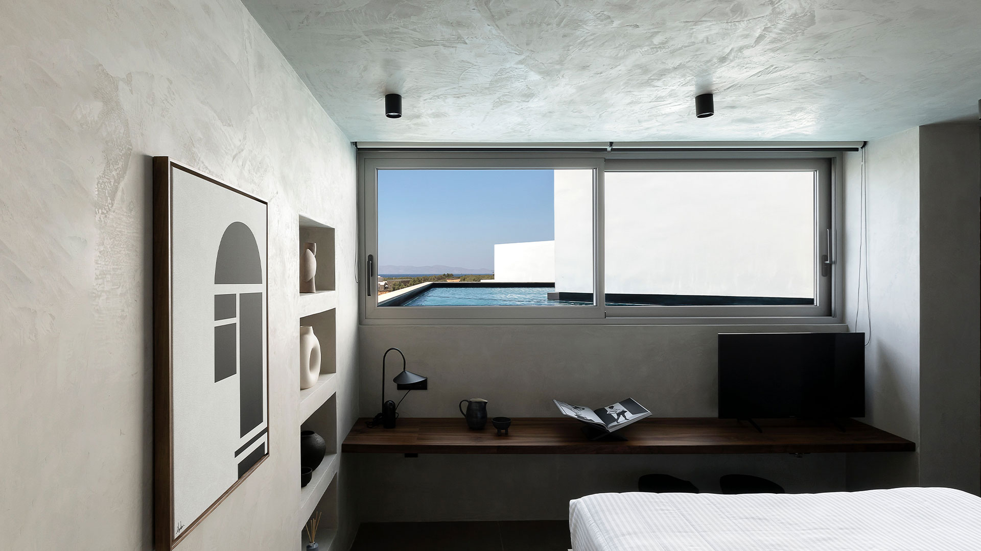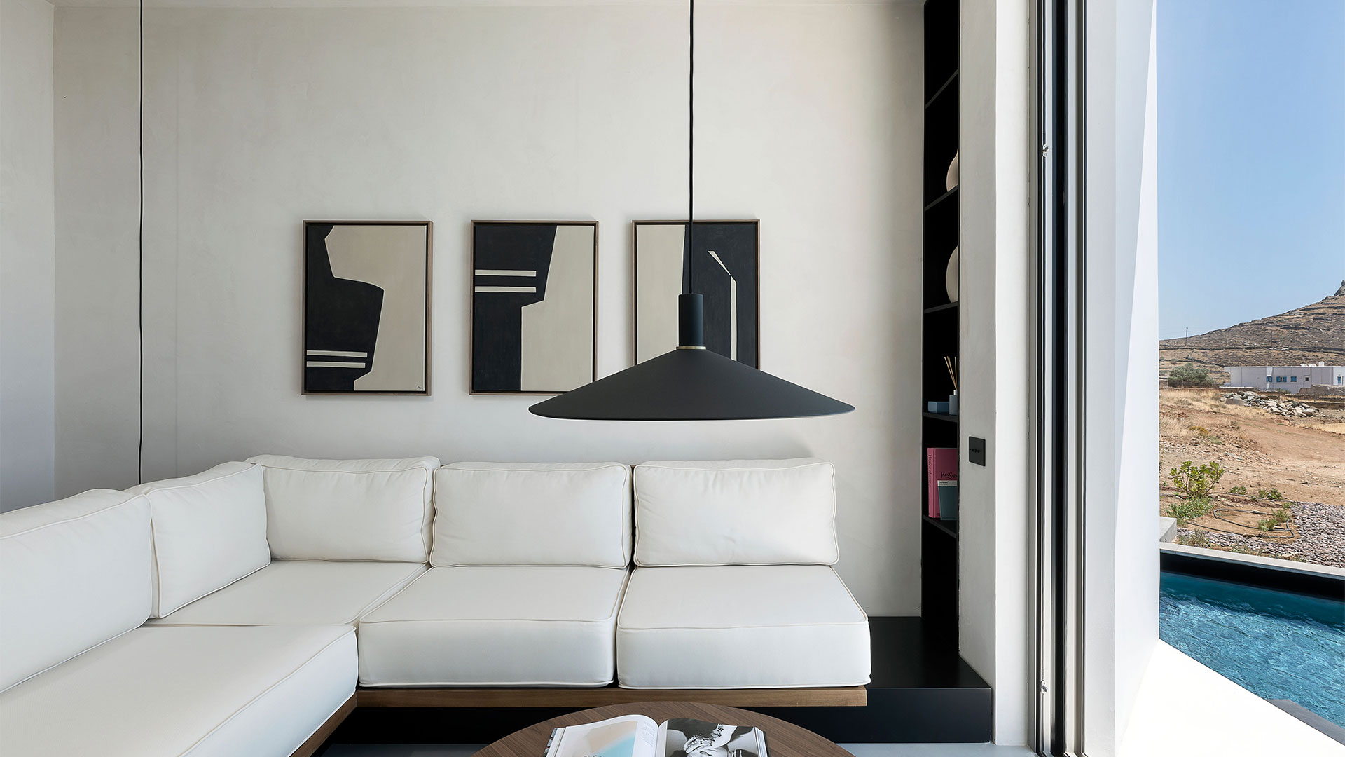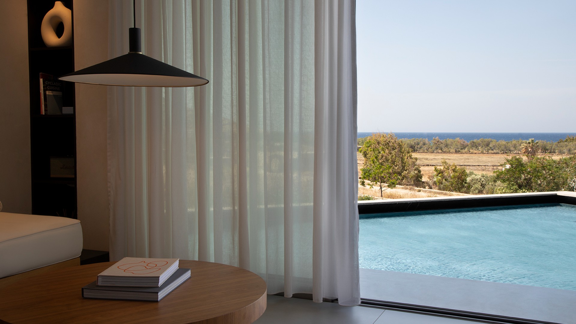 The villas embody the PNOĒS ethos: connection to the elements of earth, air and water. Earthy and textural palettes turn the private rooms into wonderful cocoons for relaxation and calmness. The lightness and airiness of the living spaces connects to the strong blues of the Aegean Seas. It's a place to breathe, relax and indulge, whether enjoying a glass of local wine on the shaded veranda, or dipping in the pool with open views to the sea, surrounded by lush Mediterranean greenery and calming white-washed surfaces.