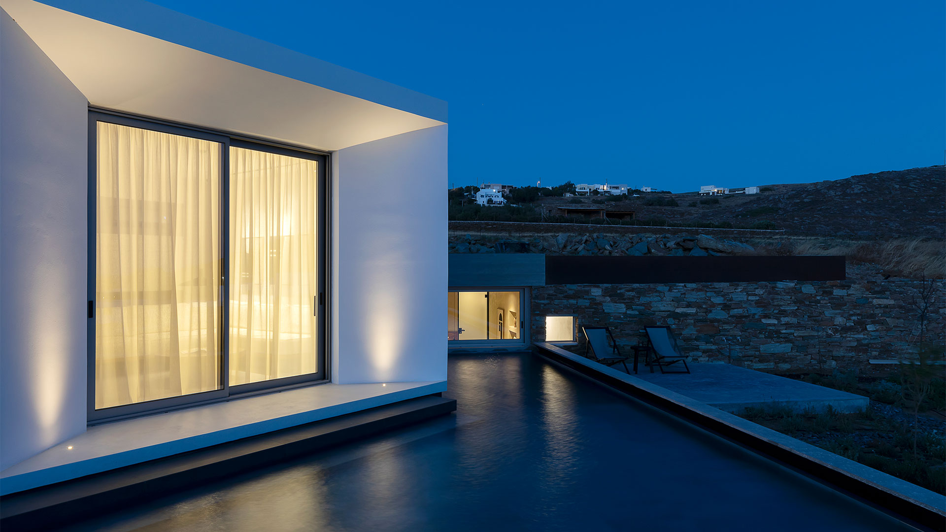 The elements of the island (wind, water) and the peculiarities of the valley (earth) are the core inspiration for the design of PNOĒS, which is deeply rooted in its environment. PNOĒS interprets the values of Cycladic architecture, making them contemporary and sophisticated. A mixture of traditional craft and modern techniques achieves a balance of contemporary and eternal. Dry stone walls and lime-washed surfaces encounter minimal steel and wood structures and broad airy openings in a carefully concerted equilibrium.