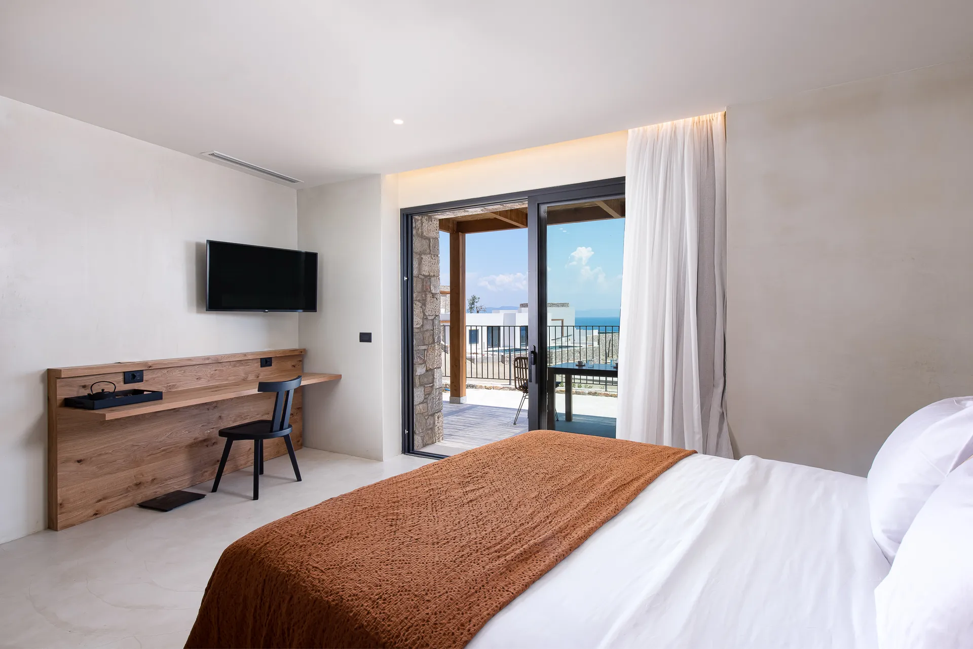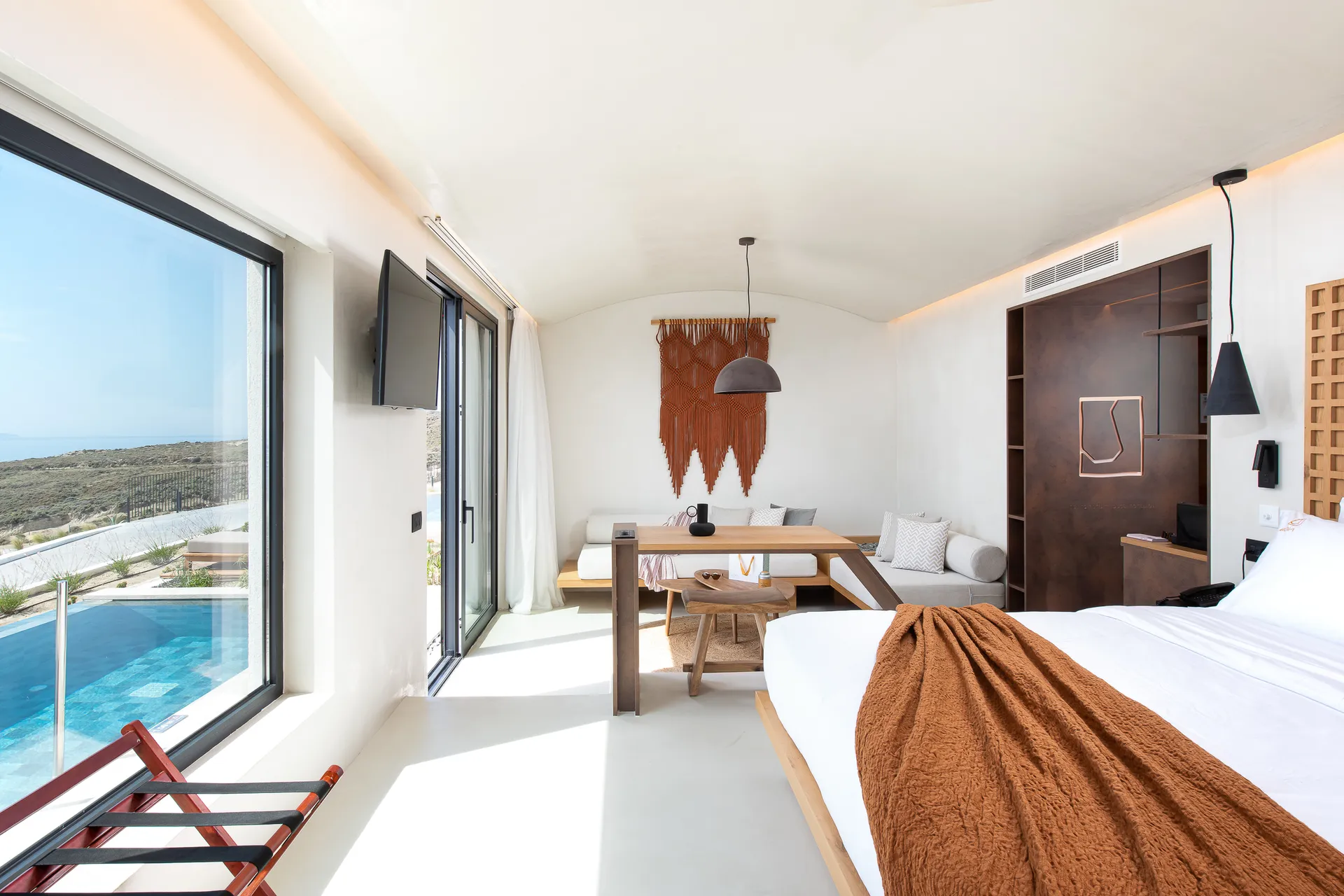 KOIA’s accommodations include a collection of thoughtfully designed suites and villas set along the hillside. The Cave Suites provide a secluded experience, while every option offers panoramic sea views. Interiors feature minimal, elegant layouts that honour natural materials such as stone and wood, paired with earthy decor that radiates warmth. Each suite is equipped with a furnished terrace or veranda to enjoy private dining, upgraded minibars, and spaces designed for relaxation beyond simple overnight stays. The configuration of the resort ensures a genuine sense of privacy, with dwellings spaced to create a feeling of autonomy away from the bustle of mass tourism.